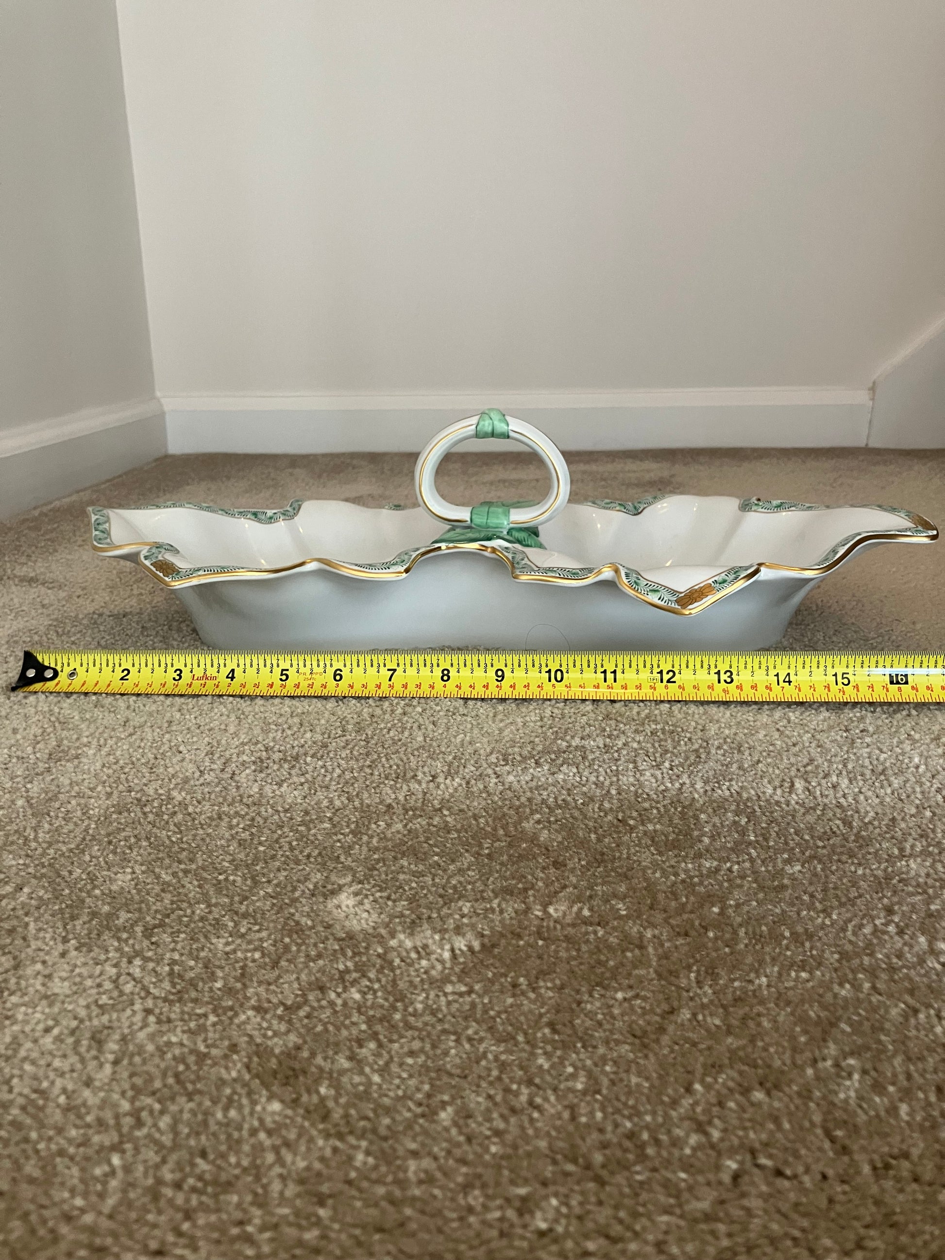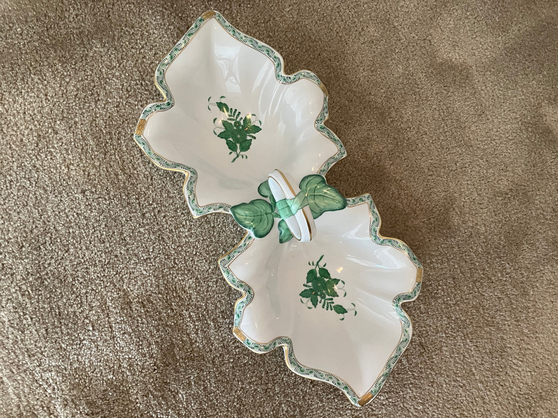 Herend Hungary Apponyi Green Leaf Serving Dish – Dual Compartment Porcelain with 24K Gold