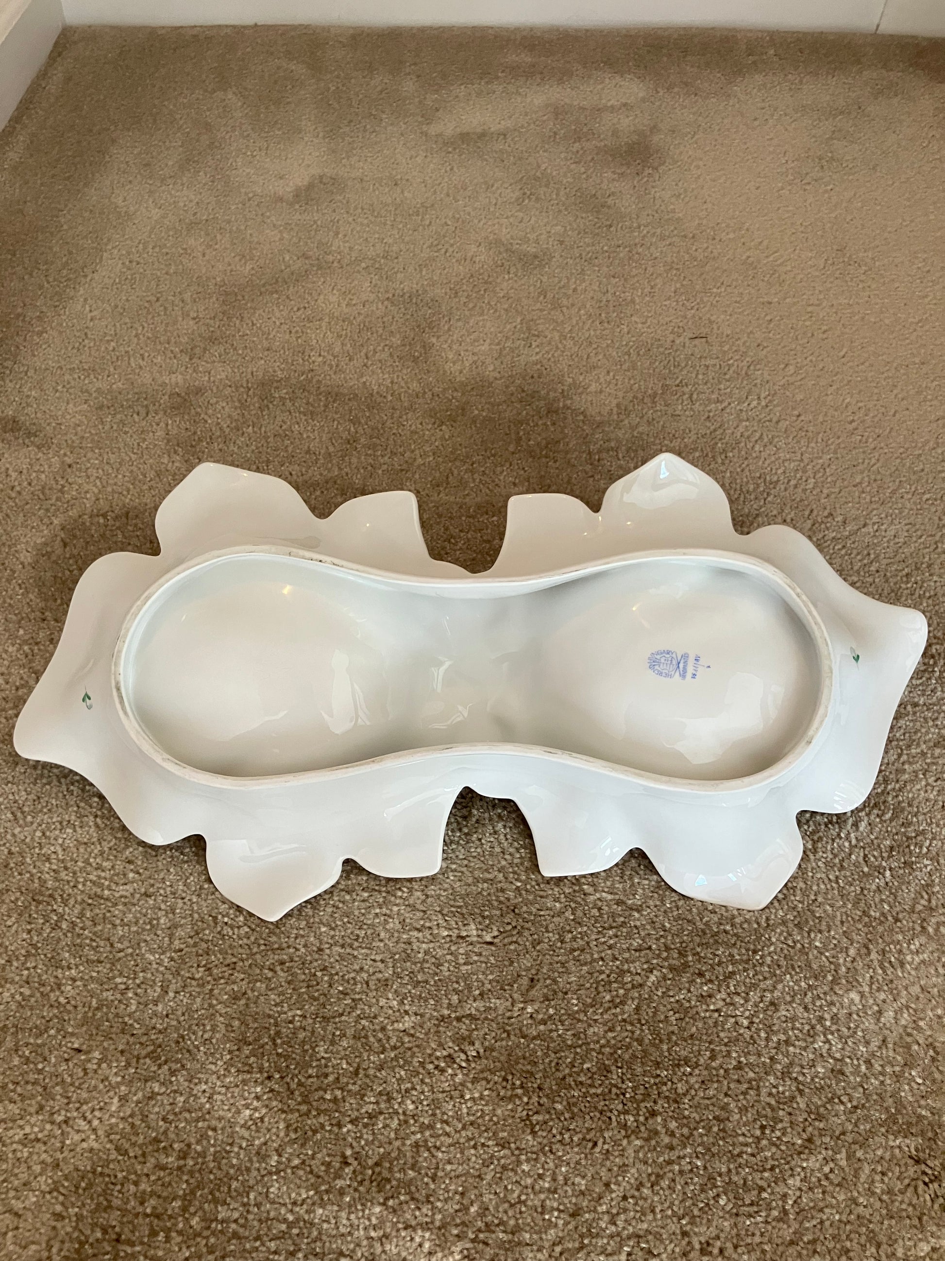 Shaped like a leaf with two compartments and an ornate gold-accented handle, this dish is both functional and decorative. Measuring an impressive 17 inches in length and 9 inches in width, it makes a stunning centerpiece for entertaining or a cherished addition to a porcelain collection.