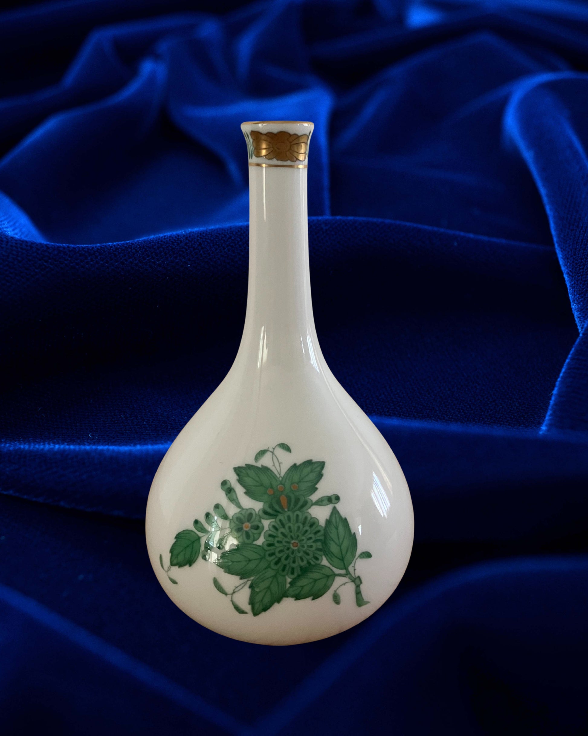 Elevate your collection with this elegant Herend Hungary porcelain bud vase (#6470) in the timeless Chinese Bouquet “Apponyi Green” pattern. A classic design introduced in the 1930s, the Apponyi motif features hand-painted green floral sprays with intricate leaves, highlighted by delicate 24K gold accents.